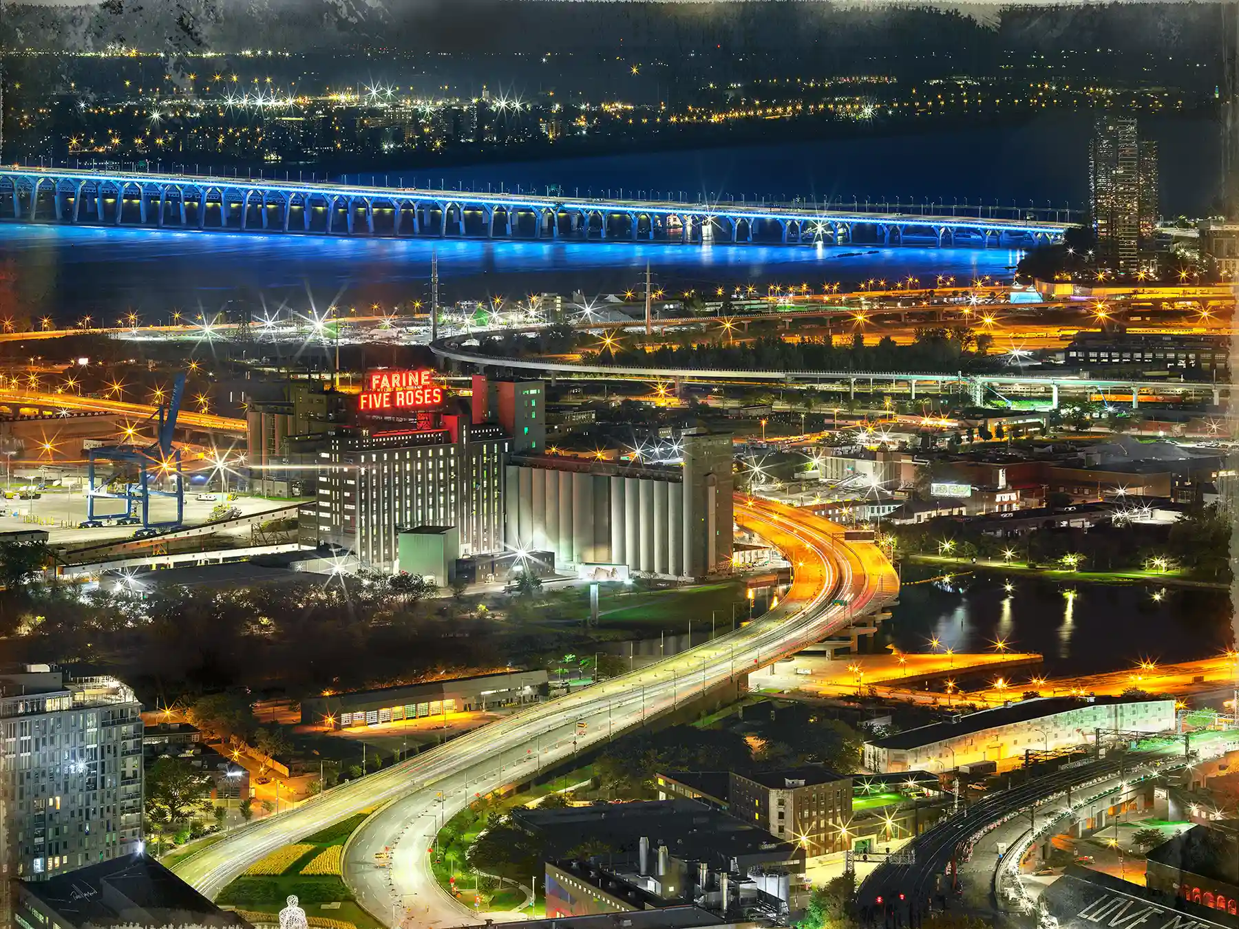Ici donc, AMALGAME MONTRÉAL, l’œuvre de mon premier arrêt sur ce toit. Angle sud-ouest. Oeil amusé sur mes premières amours en plongé, en petit, très petit. Étincelante lueur de rouge battant un rythme régulier que je connais bien. Riche vue où l’on aperçoit des serpentins ferroviaires et routiers qui fracturent les quartiers. Ocres chauds, grisailles durcies et teintes de verdure se confrontent dans une courte-pointe bien montréalaise. Un bras tend la main à la rive-sud, cette traversée nouvellement construite pour laquelle on m’interpelle occasionnellement: « as-tu faite le pont Champlain? » Haha! Non! Je ne le renie pas, mais disons qu’il n’est pas au top de ma liste de 423 sujets à explorer. Mais il sert bien ici, découpant d’un bleu laser la pénombre du moment.