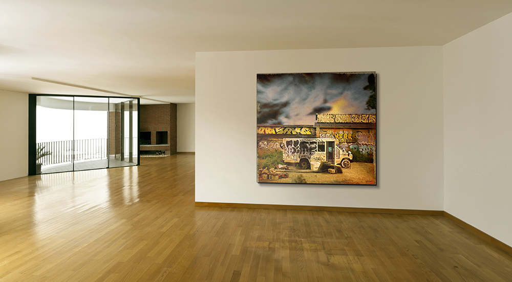 Technique mixte : photographies nocturnes, interventions numériques, impression jet d’encre sur canevas, peinture aérosol et vernis. L’édition originale est limitée à 25 exemplaires (tous formats confondus) et chacune des oeuvres de la série est légèrement différente des autres. Pour plus de détails: [email protected].
