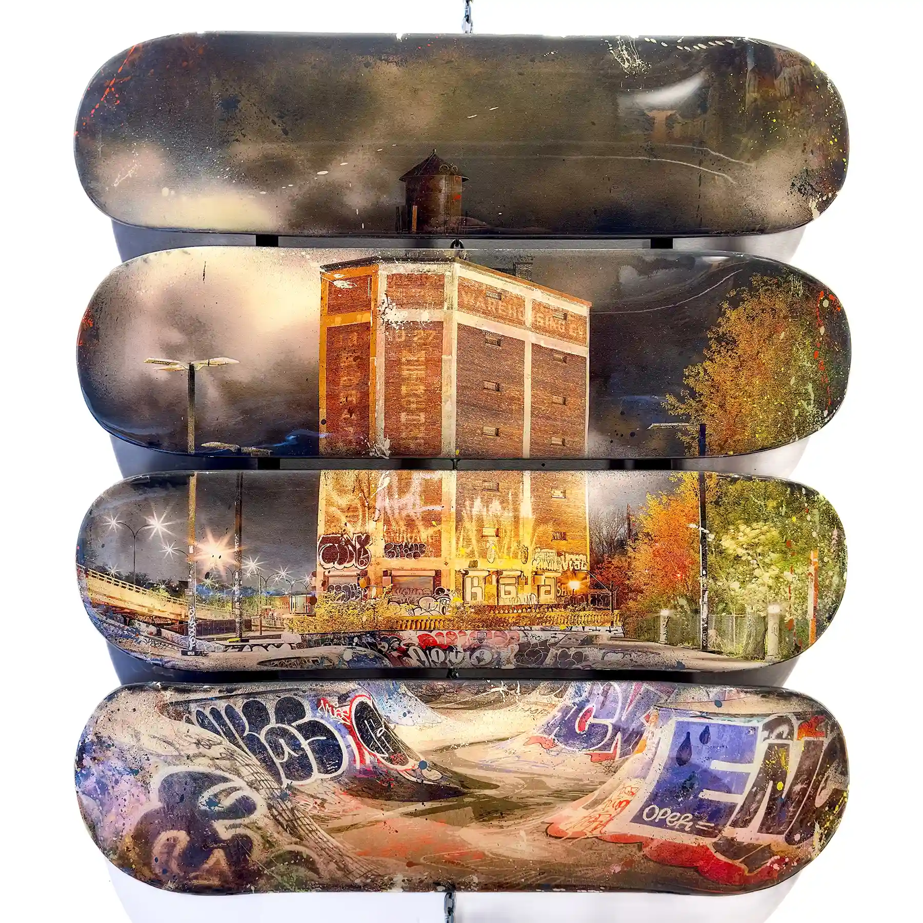 Technique mixte : photographies nocturnes, interventions numériques, impression jet d’encre sur canevas marouflé sur skateboards, peinture aérosol et époxy. Oeuvre unique. Pour plus de détails: [email protected].