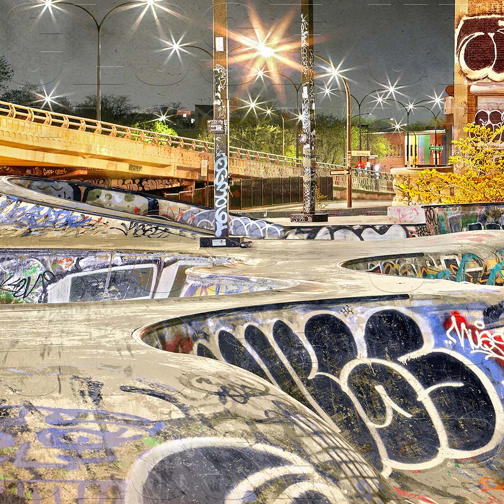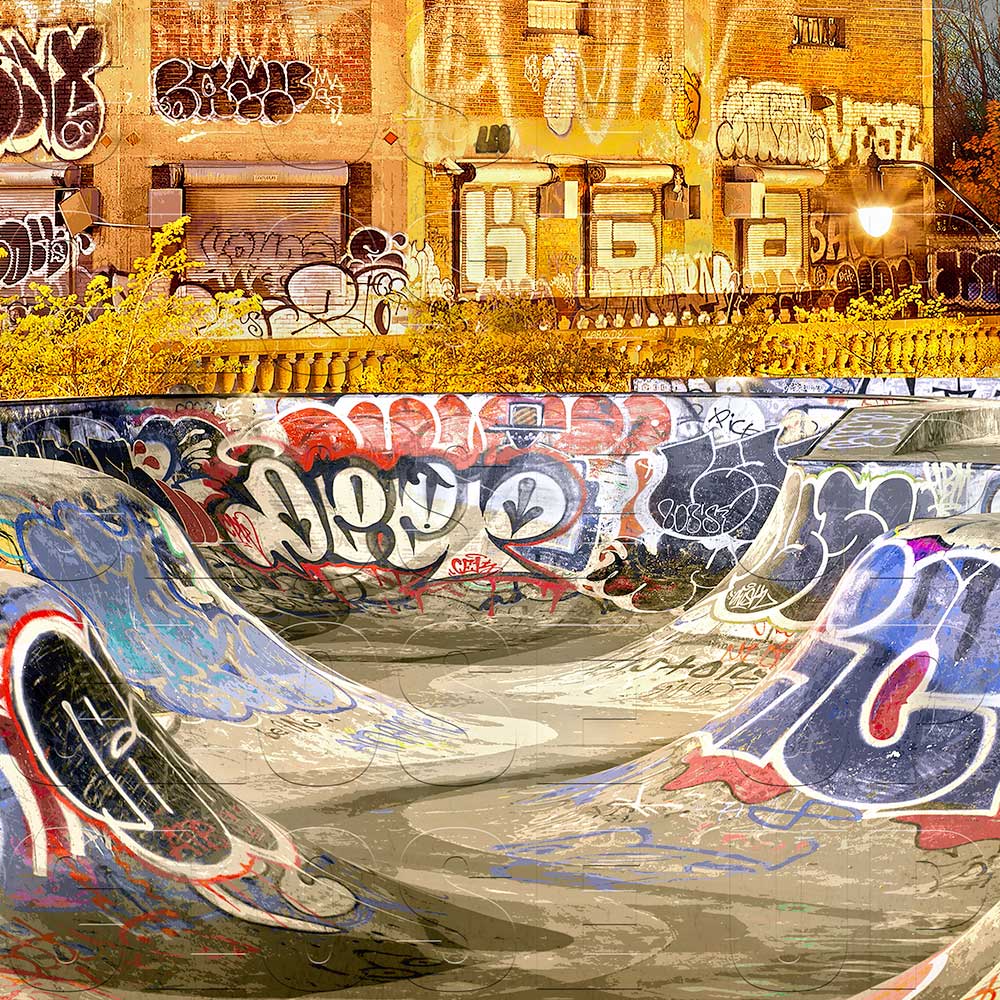 Ce n’est qu’une coïncidence dans le temps entre la présentation de cette nouvelle oeuvre et la pratique du skate par mon Léo de 9 ans. C’est davantage pour moi un retour d’intérêt vers le Warehouse Vanhorne, plus de 10 ans après avoir créé « Le Warehouse« . Le skatepark n’était pas là à l’époque. Léo non plus.