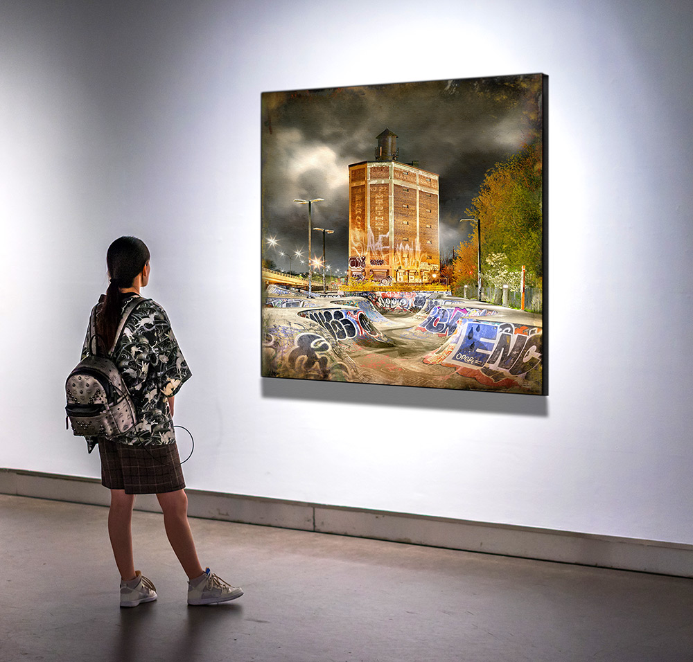 Technique mixte : photographies nocturnes, interventions numériques, impression jet d’encre sur canevas, peinture aérosol et vernis. L’édition originale est limitée à 25 exemplaires (tous formats confondus) et chacune des oeuvres de la série est légèrement différente des autres. Pour plus de détails: [email protected].