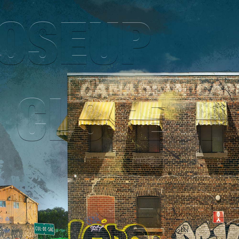 Vision émergente d’un singulier paysage nocturne, celui du quartier industriel de Côte-Saint-Paul. À l’arrière d’un entrepôt, une troublante excroissance. Ce qui lui confère avec la brique sanguine couronnée d’inquiétantes lucarnes un air de maison solitaire. Une étrange chaumière, une inquiétante demeure. Assaillie par les tags et les graffitis, le bâtiment à l’avant-plan se convertit en canevas. Voici qu’apparaît avec le regard photographique une mise en scène. Incursion rapide dans le champ historique. Le complexe appartient à la corporation en charge de la gestion immobilière des édifices publics d’obédience fédérale. La Canada Lands Company Limited (CLC LTD). L’édifice ici en saillie en accueille quelques bureaux. Une information en porte-à-faux avec l’art urbain éclatant comme un tableau. Autant d’inscriptions et de traits à même ces biens appartenant somme toute à la Couronne. Le mouvement urbain se révèle ici souverain. S’agirait-il d’une mise en demeure?