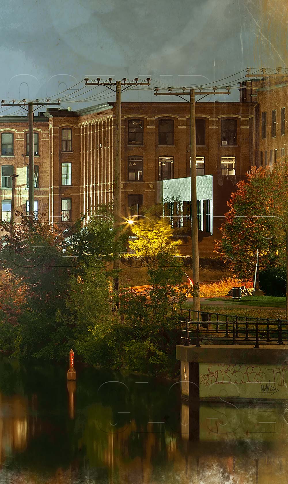 Ciel dessus ciel dessous, en surface, réfléchissant le mouvement nébuleux d’un miroir stagnant… Porte d’entrée majeure vers l’intérieur du continent, le Canal de Lachine est un important ouvrage créé par l’humain pour des besoins de contournement des forces de la nature, les rapides de Lachine sur le fleuve St-Laurent. Son ouverture en 1825 fut suivie par deux phases d’agrandissement plaçant ainsi cette voie de transition au rang des éléments d’importance quant au développement industriel du Canada et de Montréal.
