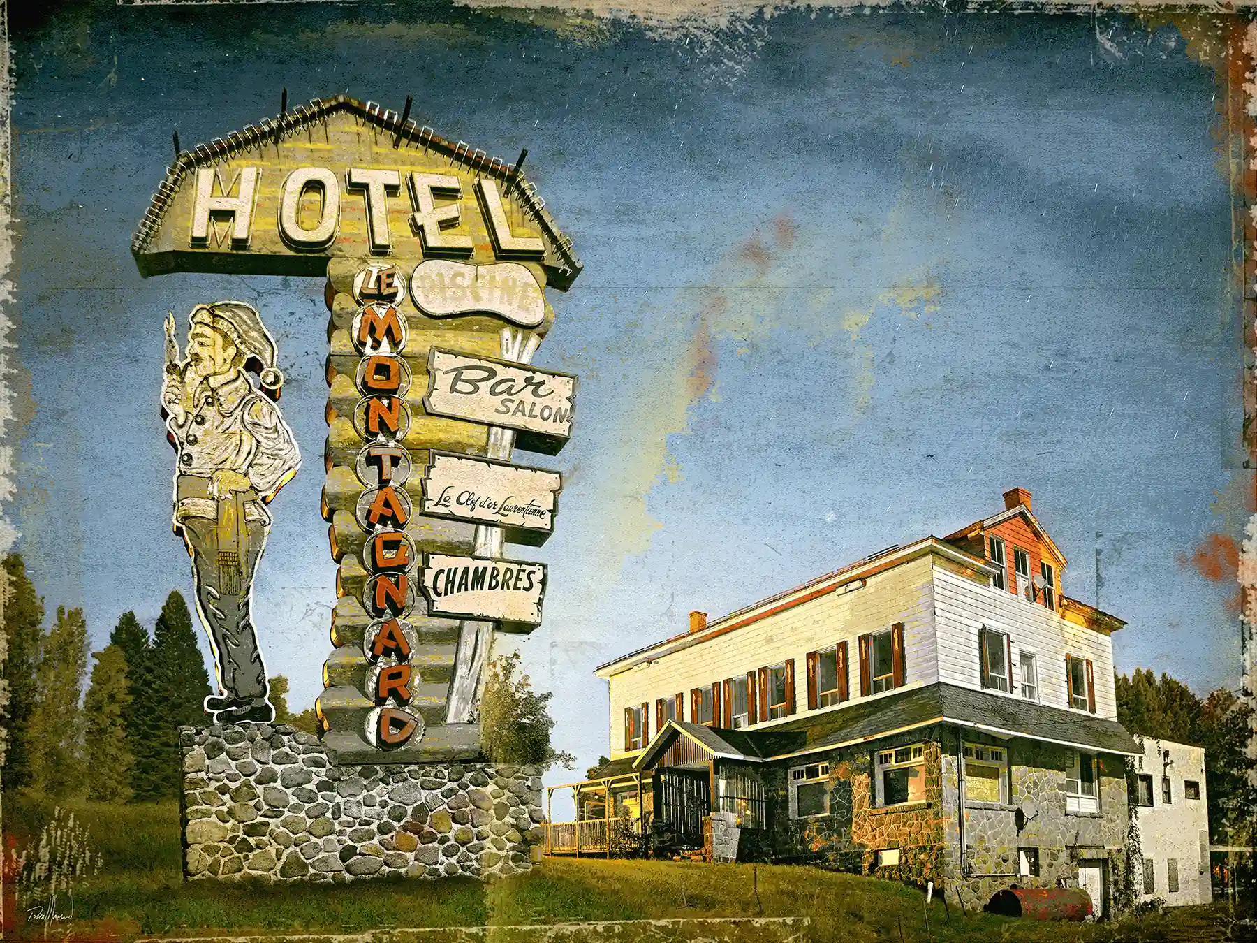 Hommage à un établissement qui raconte la petite histoire d’un coin des Pays d’en Haut. La pierre des champs typiques de la région, le bâtiment hors du temps et l’enseigne kitch sont mis en valeur par mon regard ému, posé sur cet ensemble. Bon nombre de symboles s’y trouvent. Sur l’enseigne, il y a le colon portant sa ceinture fléchée qui semble réfléchir en fumant sa pipe. Il a des inscriptions qui rappelle les panneaux à la croisée des chemins du Far West d’un passé révolu. Il a cette lumière de l’aube comme si on avait passé une courte nuit à l’auberge. Que d’histoires à raconter…