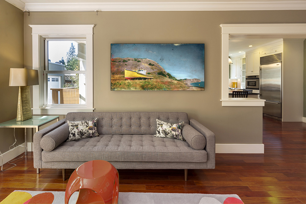 Au pied de la Butte Ronde, cette embarcation flamboyante marque la courbe qui joint un secteur résidentiel (plus loin sur la gauche) et une route panoramique meublée de magnifiques falaises.