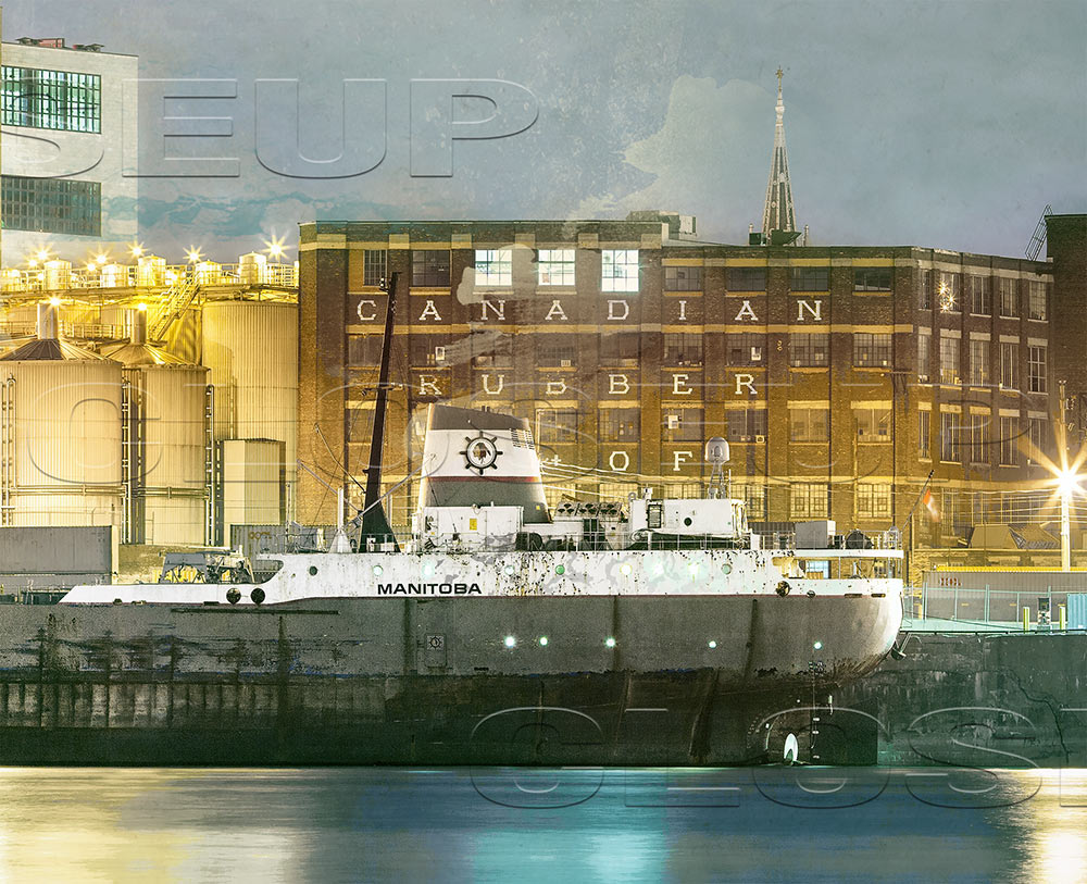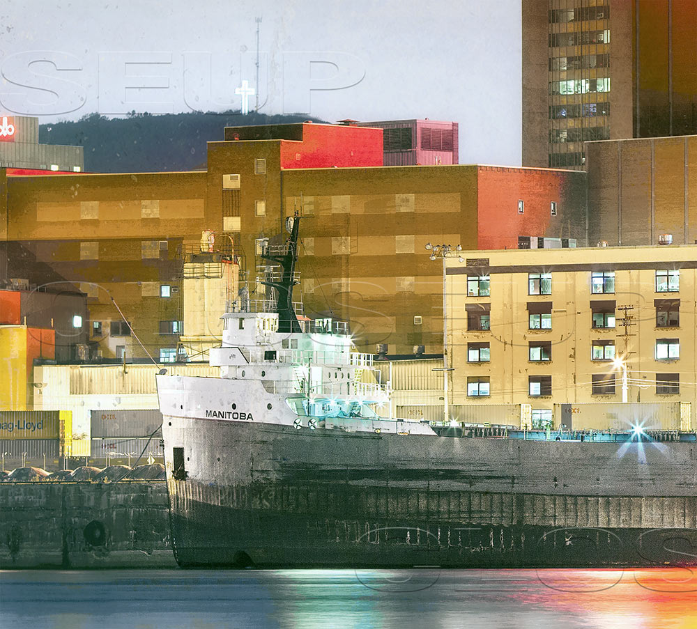 Photographies prises par Pascal Normand en 2017 à partir de l’île Sainte-Hélène, Montréal, Québec. Manitoba? Le Manitoba? Oui? Non. Le bateau, le navire, le cargo… Ce cargo se nomme Manitoba, voilà! 😉 Composition imprévue pour moi, qui suis pourtant déjà captivé par la Canadian Rubber Co. of Montreal ainsi que la Molson (voir Mtl III et Molson 2016). Mais je suis tombé sous le charme de ce point de vue, alors que j’allais à La Ronde avec mes enfants. Et puis, on m’avait dit un jour : « Si jamais tu crées une œuvre avec un cargo, laisse-moi savoir… » Voilà, c’est fait! J’adore ce décor industriel qui s’élève, riche en textures et en angles irréguliers. Un intérêt particulièrement naturel pour moi en ces jours où nul ne sait ce qui adviendra de la « forteresse » Molson puisqu’une chose est sûre, l’entreprise déménagera au cours des prochaines années. Une icône fantomatique… Et parlant de fantôme, une certaine tour controversée se pointe le bout de l’antenne à l’arrière…Telles des escapades intuitives où chaque cliché devient une étape distincte dans le processus créatif, les sorties nocturnes dédiées à la capture des sujets s’apparentent à une chambre noire à ciel ouvert. Dès lors, la nuit devient une scène riche en rencontres inspirantes, prête à révéler les nuances subtiles et délicates des ombres et de la lumière.