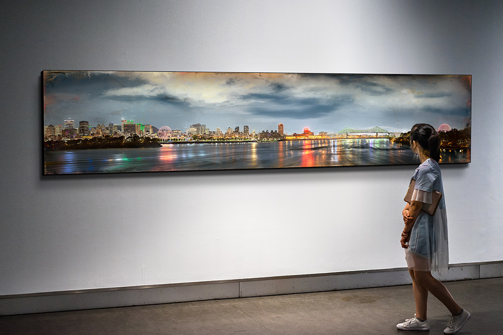 MTL VI est un grand écart qui peut rappeler l’œuvre précédente de type skyline (HAUTEVILLE – aka MTL V), mais qui propose une composition bien différente. Son ratio très allongé fait rêver quant aux possibilités de grands formats… Un majestueux 52″x260″ dans votre salon, ça vous dit? Vous devrez peut-être davantage viser le corridor! HAHA!