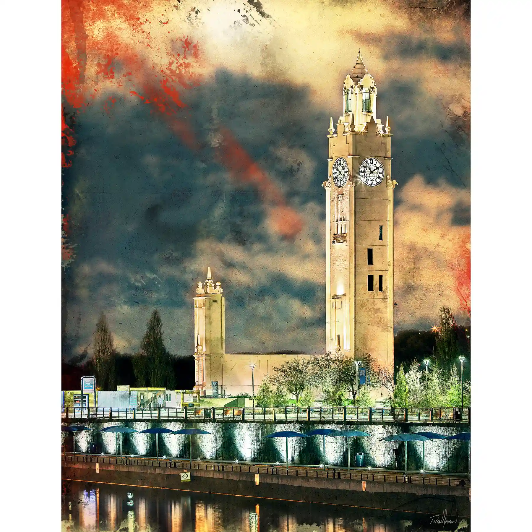Montréal ne serait pas Montréal sans ce quai que l’on distingue de loin grâce à son emblème : sa grande horloge d’un blanc presque immaculé. En prenant la photo, j’ai voulu rendre la beauté de la tour de l’horloge à l’état brut. Une prise de nuit et on y voit le ciel qui danse avec cette femme, témoin du temps, entourée d’arbres et d’eau miroir. Les jets rouges de peinture donnent du caractère et un certain romantisme à la scène.
